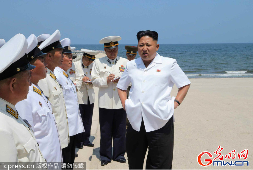当地时间2014年7月2日,据朝鲜《劳动新闻》报道,金正恩视察朝鲜海军,指导官兵游泳训练。