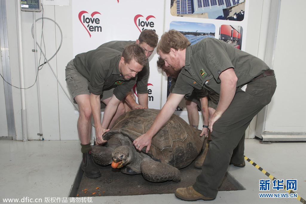当地时间2014年7月1日,澳大利亚悉尼,澳大利亚爬行动物公园的工作人员为63岁的加拉帕戈斯象龟“雨果”进行一年一度的称重工作。今年,“雨果”的体重达到166公斤,比去年增加了1公斤。爬行动物公园的总经理 Faulkner对这一结果表示满意,Tim称“雨果”的体重与去年相近是其身体健康的表现,因为体重剧增或者骤减都有可能是因疾病引起的。四名工作人员将它躯抬到铲车上,然后铲车把它放到工业称上称重。图片来源:东方IC