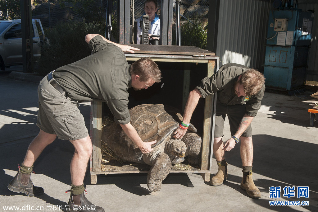 当地时间2014年7月1日,澳大利亚悉尼,澳大利亚爬行动物公园的工作人员为63岁的加拉帕戈斯象龟“雨果”进行一年一度的称重工作。今年,“雨果”的体重达到166公斤,比去年增加了1公斤。爬行动物公园的总经理 Faulkner对这一结果表示满意,Tim称“雨果”的体重与去年相近是其身体健康的表现,因为体重剧增或者骤减都有可能是因疾病引起的。四名工作人员将它躯抬到铲车上,然后铲车把它放到工业称上称重。图片来源:东方IC