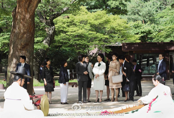 新华网北京7月3日电 据新华社“新国际”微博报道,习近平主席夫人彭丽媛3日下午在韩国官员陪同下参观被列为世界文化遗产的昌德宫,了解宫殿建筑历史、音乐传承等情况,并欣赏韩国传统乐器伽倻琴散调表演,对艺术家的精彩演出表示高度赞赏。彭丽媛说,中韩友谊源远流长,欢迎韩国朋友多到中国参观访问。