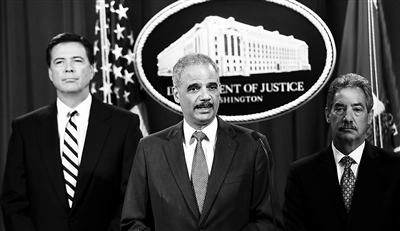 6月30日,美国司法部宣布,法国巴黎银行已经同意认罪,承认违反美国法律为美国实施制裁的国家转移资金,为此法国巴黎银行将支付89.7亿美元罚款。图为美国司法部长埃里克-霍尔德(中)图片/IC