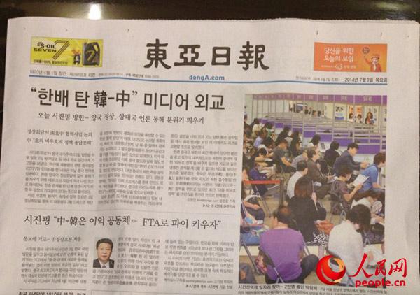韩国《东亚日报》在头版显著位置刊发习近平主席署名文章《加快自贸区谈判进程 做大利益蛋糕》金慧廷 摄