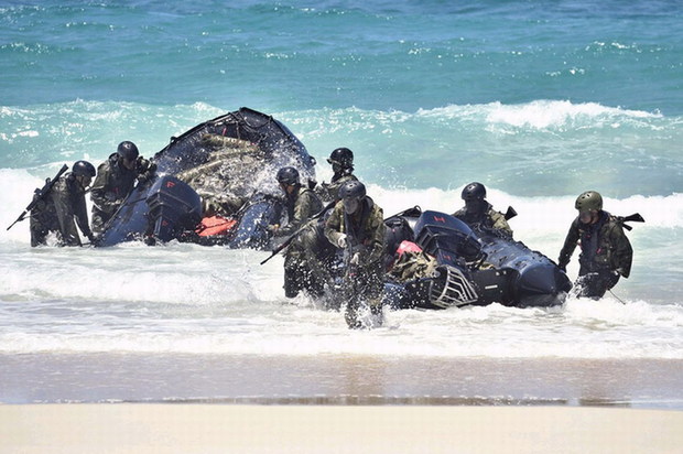 日本陆上自卫队员正在使用橡皮艇登陆(网页截图)