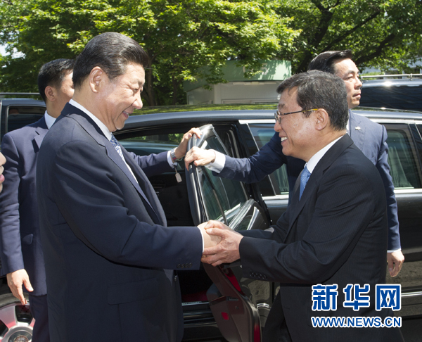 7月4日,国家主席习近平在韩国国立首尔大学发表题为《共创中韩合作未来 同襄亚洲振兴繁荣》的重要演讲。这是首尔大学校长吴然天迎接习近平主席。新华社记者 谢环驰 摄
