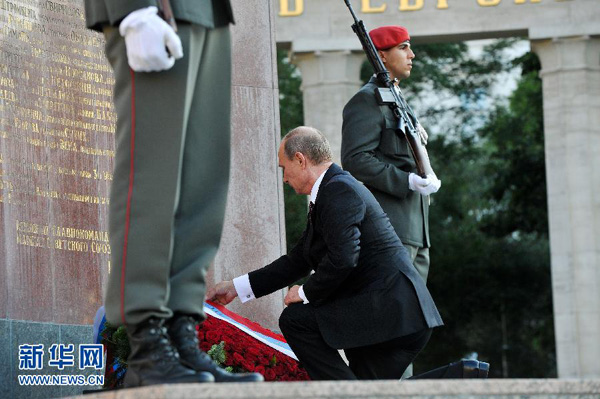 6月24日,在奥地利首都维也纳,俄罗斯总统普京在苏军英雄纪念碑前默哀。当日,正在奥地利进行正式工作访问的俄罗斯总统普京来到维也纳黑山广场,向苏军英雄纪念碑献花,缅怀在第二次世界大战中为解放奥地利而牺牲的苏联红军战士。新华社记者 钱一 摄