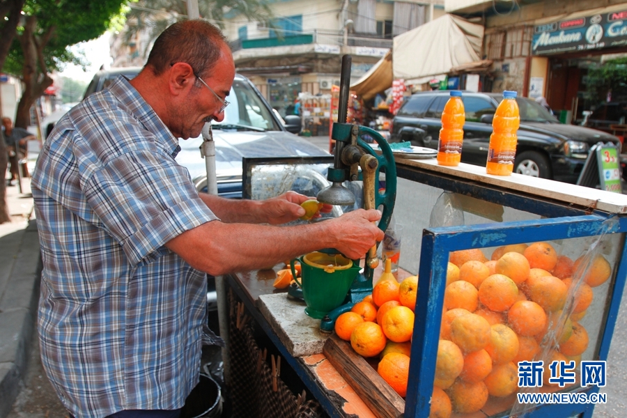 7月3日,在黎巴嫩北部城市的黎波里,一黎巴嫩人在用鲜橙榨汁,供顾客购买。鲜汁是斋月开斋饭桌上不可缺少的饮料。(哈立德 摄)