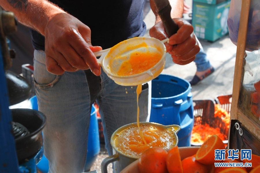 7月3日,在黎巴嫩北部城市的黎波里,一黎巴嫩人在制作鲜汁,供顾客购买。鲜汁是斋月开斋饭桌上不可缺少的饮料。(哈立德 摄)