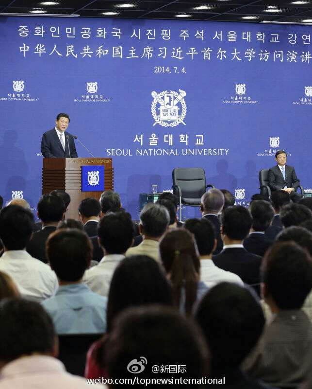 新华网北京7月4日电 据新华社“新国际”微博报道,首尔大学的大讲堂座无虚席,倾听中国,感受中韩梦想的交汇。习主席说,要有海纳百川的胸怀,以开放包容心态虚心倾听世界的声音。中国将继续向世界学习、向各国人民学习,学习人类创造的一切文明成果,推动中国和世界发展得更好。