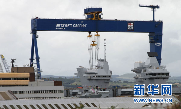 这是7月4日拍摄的苏格兰东部法夫区罗塞斯的造船厂船坞上的“伊丽莎白女王”号航空母舰。新华社记者 郭春菊 摄