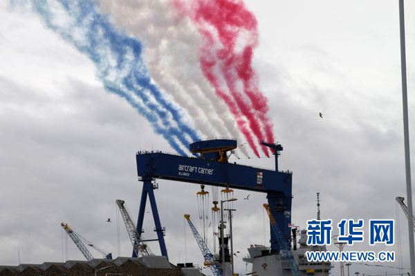7月4日,英国皇家空军红箭飞行表演队在苏格兰东部法夫区罗塞斯的造船厂“伊丽莎白女王”号航空母舰命名仪式上进行飞行表演。新华社记者 郭春菊 摄
