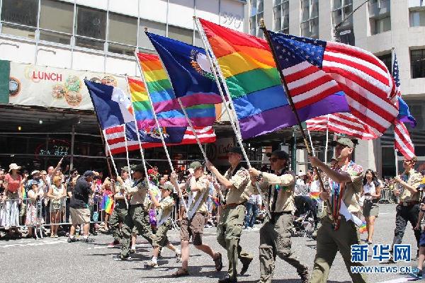 6月29日,纽约举行了规模盛大的同性恋大游行。男同性恋、女同性恋、双性恋、变性人,以及他们的支持者纷纷走上街头,挥舞着彩虹旗,庆祝美国同性婚姻合法化1周年。