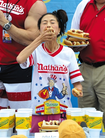 7月4日,纽约举行吃热狗大赛,参赛选手正大嚼热狗。吃热狗竞赛是纽约康尼岛庆祝独立日的一项传统趣味活动。新华社发