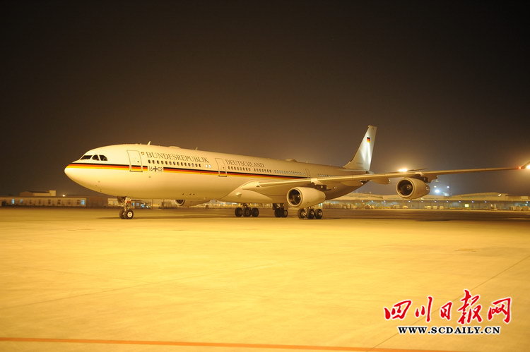 四川日报网消息(记者 刘淼淼 摄影 欧阳杰)应国务院总理李克强邀请,德意志联邦共和国总理安格拉·默克尔于7月6日至8日对中国进行正式访问。7月5日晚11点44分,默克尔乘坐的专机降落在成都双流国际机场,拉开了默克尔第7次访华的序幕。