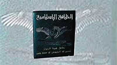 ISIS发放的“伊斯兰国”护照,封面上除了有“伊斯兰哈里发国”字样外,还有该组织的旗帜。
