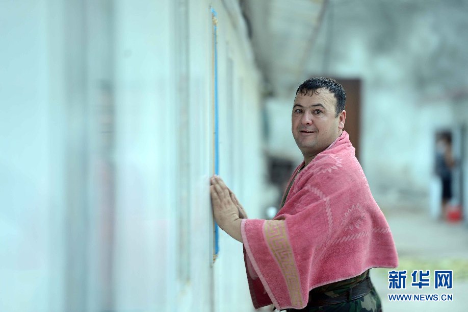 7月5日,乌兹别克斯坦安革连至琶布铁路隧道项目安革连隧道进口西口分部,一名乌兹别克员工下班后在生活区。(沙达提 摄)