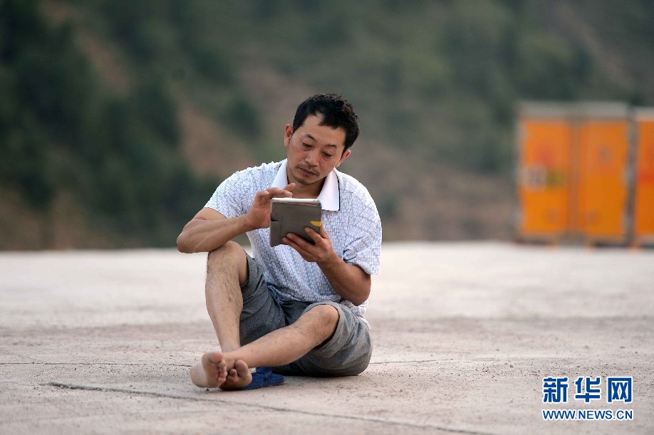 7月5日,乌兹别克斯坦安革连至琶布铁路隧道项目安革连隧道进口西口分部,几名员工在与家人通电话。(沙达提 摄)