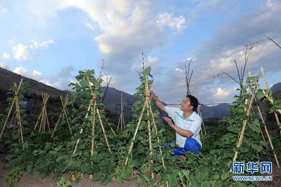 7月5日,乌兹别克斯坦安革连至琶布铁路隧道项目安革连隧道进口西口分部生活区,杜潮停在菜地查看豆角长势。(沙达提 摄)