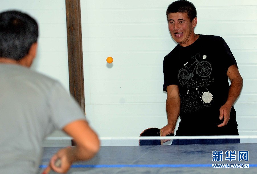 7月5日,乌兹别克斯坦安革连至琶布铁路隧道项目安革连隧道进口西口分部,乌兹别克员工在打乒乓球。(沙达提 摄)