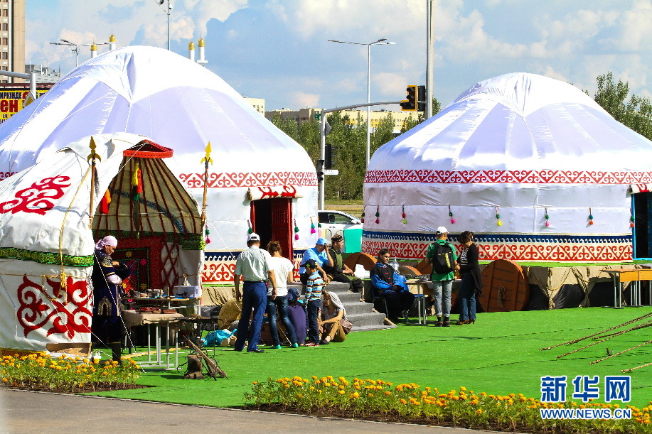 近日在哈萨克斯坦首都阿斯塔纳,为迎接即将到来的首都日,在当地标志性建筑“可汗帐篷”附近举行活动重现哈萨克游牧生活。据悉,这次活动的中心是一座由哈萨克毡房组成的小镇,在小镇的中心有一个广场。在庆祝首都日的几天中这里将举行不同的演出,以重现哈萨克民俗文化和传统生活,如哈萨克传统婚礼。在小镇里还有一个市场,专门出售哈萨克民族工艺品,如哈萨克民族服饰,木质和陶制的盘子等。在小镇附近还有一个占地1600平方米的跑马场,有专业人士表演特技马术,也可以让普通民众骑马进行体验。(Dinara 摄)