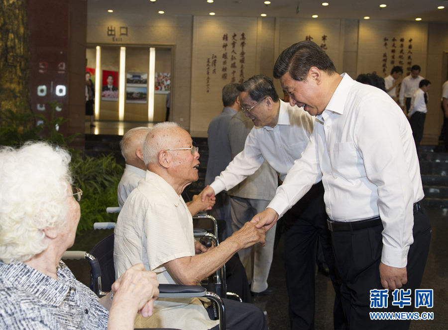 7月7日,首都各界在中国人民抗日战争纪念馆隆重集会,纪念全民族抗战爆发77周年。中共中央总书记、国家主席、中央军委主席习近平出席纪念仪式并发表重要讲话。这是参观结束后,习近平等亲切看望参加仪式的抗战老战士和老同志代表。新华社记者 黄敬文 摄