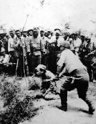 右图:侵华日军南京大屠杀中,日军为新兵进行杀人示范。(资料图片)