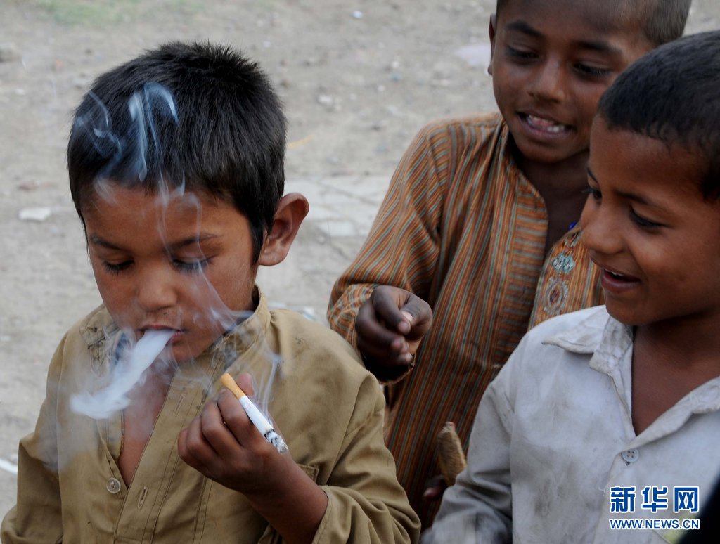 2014年7月8日消息(具体拍摄时间不详),巴基斯坦拉合尔,一群生活在贫民窟的小男孩在抽烟。这些触目惊心的画面摄于贫民区的街道上,小孩中年龄最小的仅有5岁。旁边目睹着这一切的成年人看上去漠不关心。摄影师Irfan Chudhary在去往贫民区的途中拍下了这组画面。图片来源:CFP