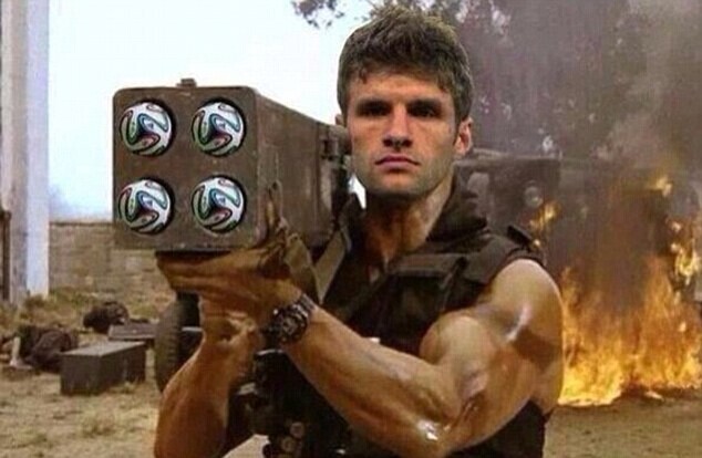 5 神射手:德国球员穆勒的头像被移花接木到施瓦辛格身上,他扛着火箭炮,炮弹却变成了4个巴西世界杯的用球。