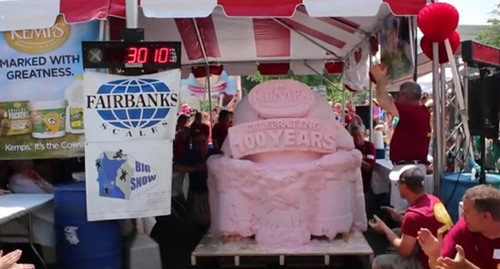 中新网7月9日电 据香港《文汇报》9日报道,美国威斯康星州一家牛奶公司近日为庆祝成立100周年,特别制作了重达3010磅(约1.4吨)的全球最大冰激淋蛋糕,并获得了吉尼斯世界纪录大全的认证。