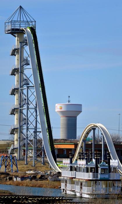 据英国《每日邮报》2014年7月9日报道,美国堪萨斯城建成一座世界上最高最快的水滑梯,168英尺高,大约17层楼高。这个水道专门为那些肾上腺分泌过多的人设计,如果你在爬完264级台阶还没退缩的话,你会乘坐专门设计的划水车同其他3个个人一同感受地心引力的召唤,17层楼高!超过100公里每小时的速度!(网页截图)