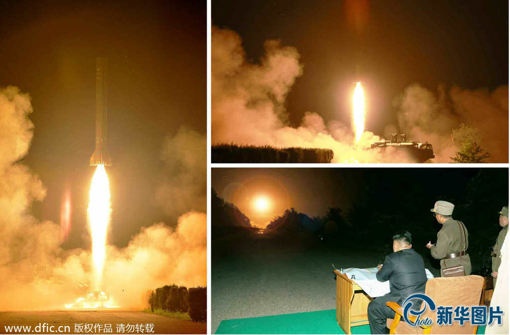 当地时间2014年7月10日,据朝中社报道,朝鲜最高领导人金正恩日前指导了朝鲜人民军战略军西部前线部队进行战术火箭试射训练。 (来源:东方IC)