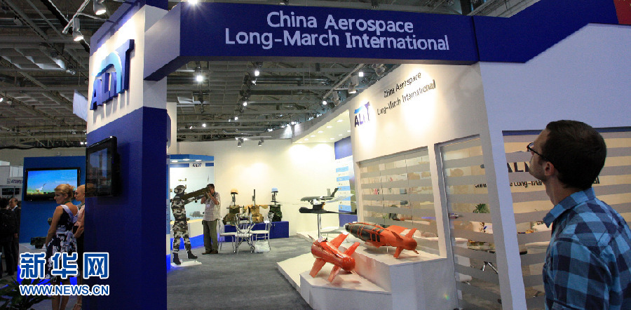 中国航天长征国际贸易有限公司的展台全景,橙色的武器是由轰炸机投掷的制导炸弹,陈俊峰摄