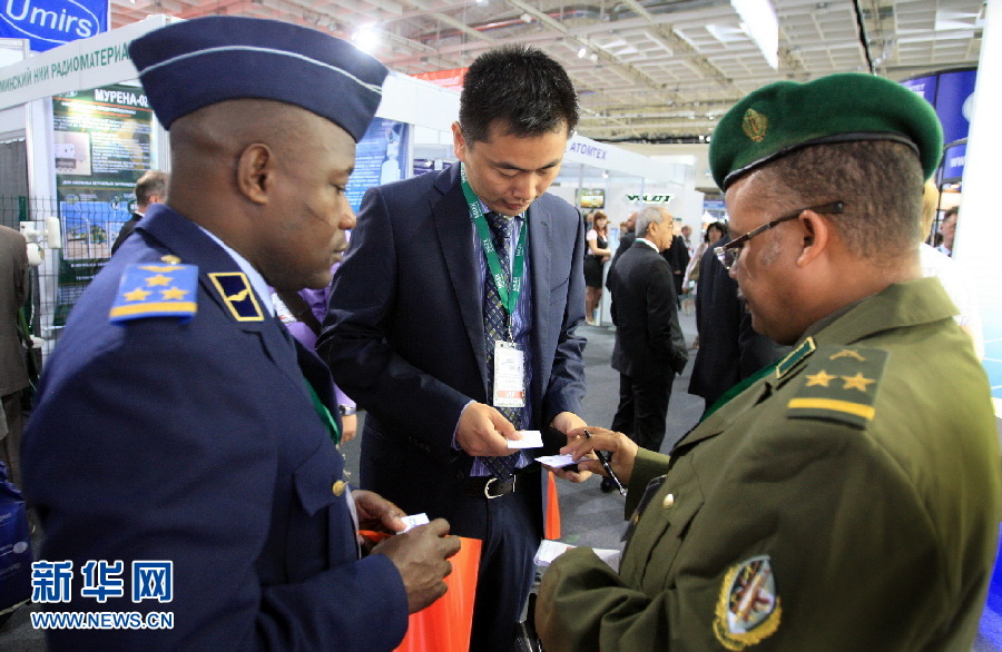 中国参展人员同前来参观的其他国家军人交换名片,陈俊峰摄