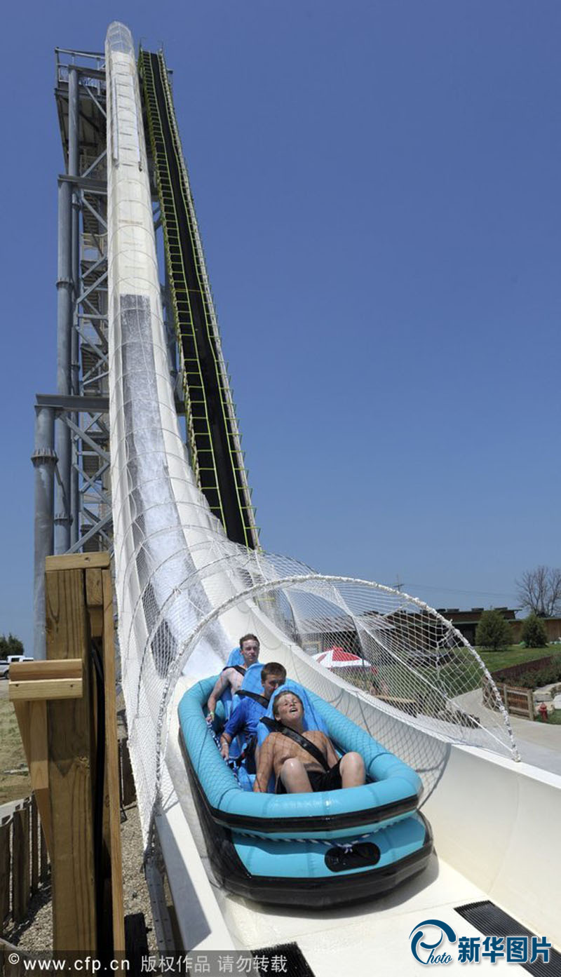 当地时间2014年7月10日,美国堪萨斯城建成一座世界上最高最快的水滑梯,168英尺高,大约17层楼高,水滑梯当日正式对公众开放。这个水道专门为那些肾上腺分泌过多的人设计,如果你在爬完264级台阶还没退缩的话,你会乘坐专门设计的划水车同其他3个人一同感受地心引力的召唤,17层楼高!超过100公里每小时的速度!