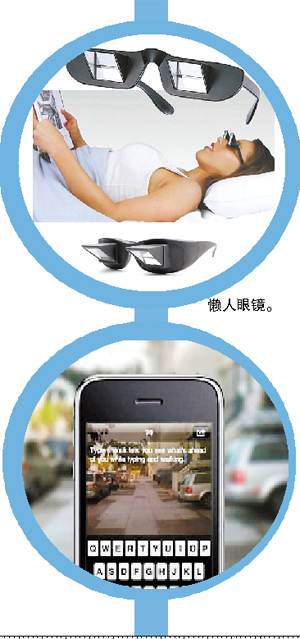 调查表明,经常低头或仰头工作和有低头生活习惯者,颈部经常处于屈曲位或伸展位,颈部肌肉过度疲劳,这是导致颈椎病发作的主要原因之一。网络零售商ThinkGeek设计了一款特殊的懒人眼镜Lazyglasses。这款眼镜采用特制的反射镜面组合而成,可以让你轻松地抬头看手机、平板。
