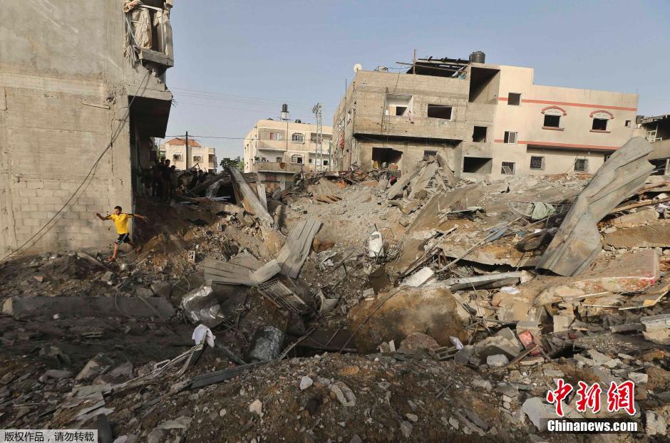 以色列空袭加沙地带的行动12日进入第五天。医疗部门的消息称,截至12日清晨,空袭又造成16名巴勒斯坦人身亡,死亡人数上升至121人。图为当地时间7月12日拍摄的受到空袭的加沙地区满目疮痍。