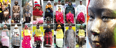 日本驻韩大使馆前的慰安妇雕像竖立以来饱受民众关怀,天冷有人给她戴帽子系围巾披毯子,雨天有人给她穿雨衣。