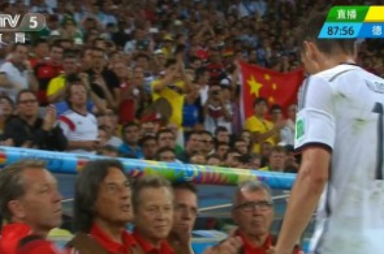 中新网7月14日电 在今天凌晨进行的巴西世界杯决赛中,阿根廷队迎来了德国队的挑战。电视转播镜头捕捉到了一个有趣的画面,在场边出现了高举着中国国旗的中国球迷。