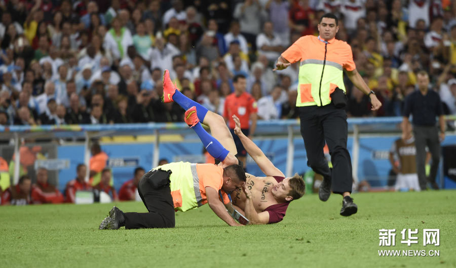 7月13日,一名闯入球场的球迷被工作人员控制。当日,在巴西里约热内卢马拉卡纳大球场进行的2014年巴西世界杯决赛中,德国队对阵阿根廷队。新华社记者杨磊摄