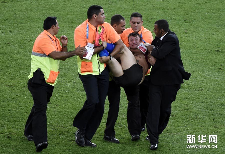 7月13日,一名球迷闯入球场后被工作人员带走。当日,在巴西里约热内卢马拉卡纳大球场进行的2014年巴西世界杯决赛中,德国队对阵阿根廷队。新华社记者吕小炜摄