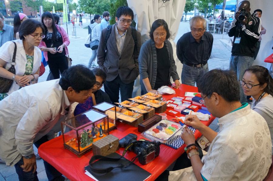 中国彩塑的现场表演吸引了不少观众驻足观看。