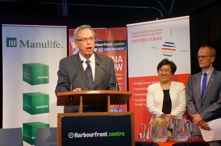 加拿大联邦政府财政部长乔.奥立弗代表加拿大政府到会致贺。右一为主持人大多伦多港前艺术中心总裁威廉·博伊尔,右二为主持人加拿大国际文化基金会主席吴永光医生。
