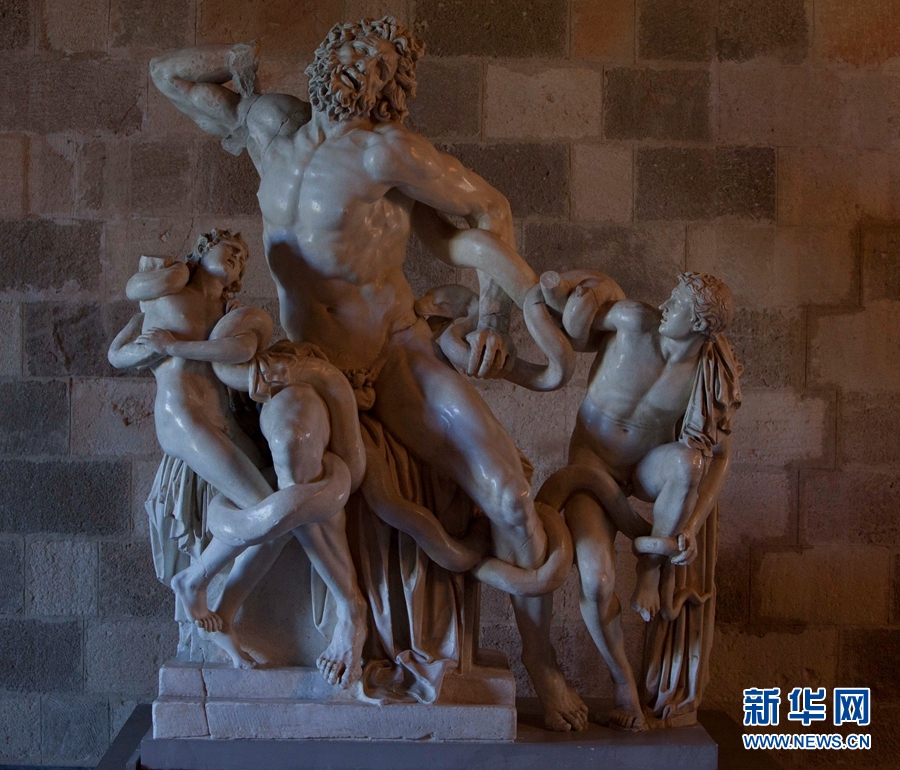 7月12日,罗得岛大长老宫殿展示的拉奥孔雕塑复制品。在古代社会,由于地处欧、亚、非三大洲交界处,罗得岛享有高度的文明,创造了辉煌的文化,尤其在雕塑艺术上达到了登峰造极的地步。产生于希腊化时期的雕塑杰作——拉奥孔(现藏于梵蒂冈博物馆)即出自古代罗得岛艺术家之手。新华网记者 刘咏秋摄