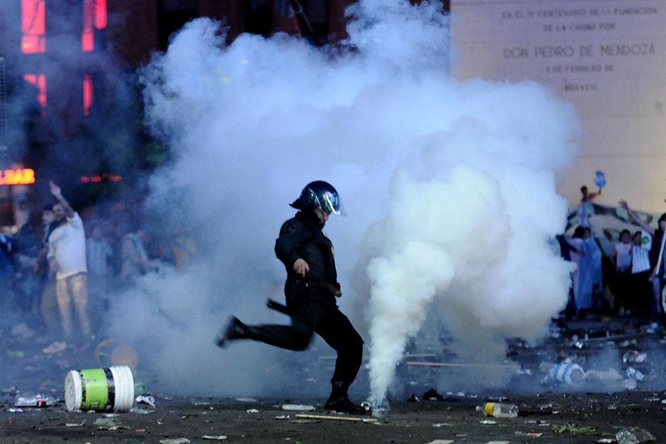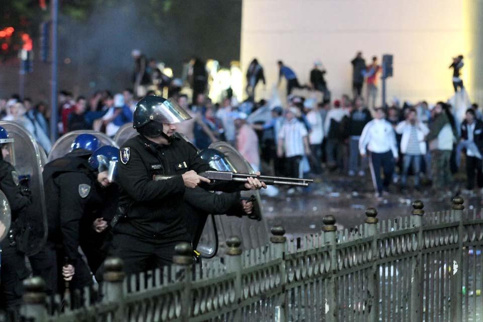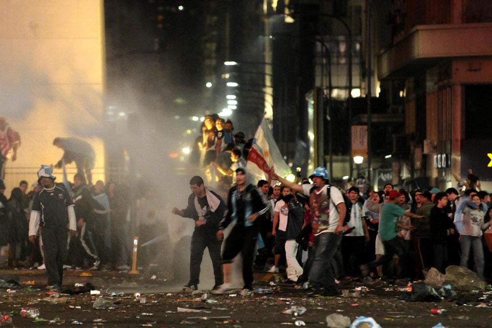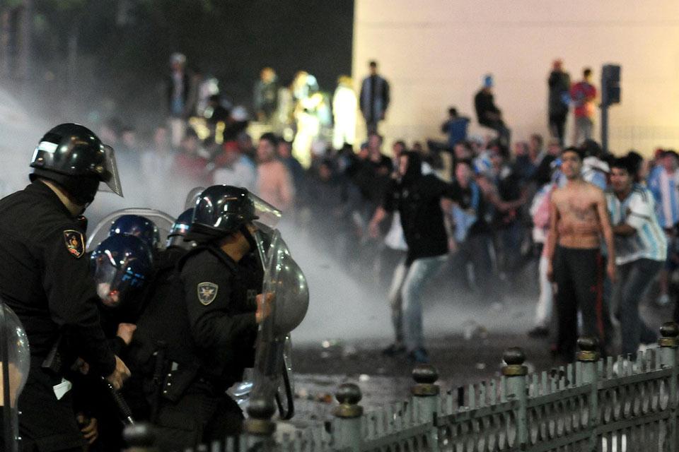 据悉,骚乱事件发生最初时,有15名阿根廷球迷爬上一辆阿根廷TN电视台的录像车,球迷们损坏了录像车的天线,并迫使车内的众多记者从车里逃出。 之后,场面更加不可控制,球迷们向警卫人员抛掷石子,而球迷之间也不断发生互殴情况。警方为了控制局面,使用催泪瓦斯驱散闹事者,而聚集在奥贝里斯克区的球迷们看到骚乱后,四处散逃。
