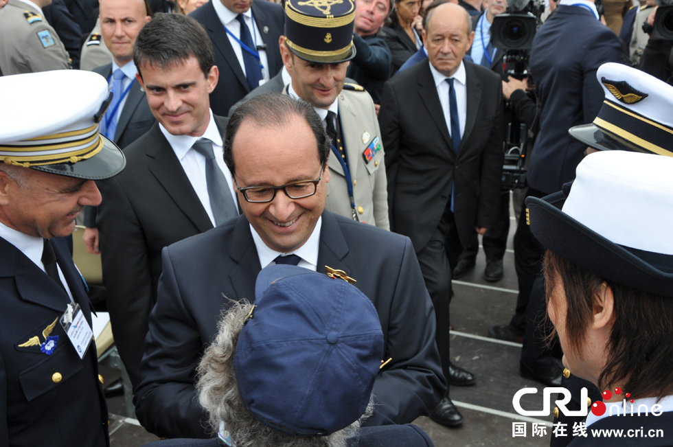 法国总统奥朗德在总理瓦尔斯和国防部长勒德里昂的陪同下,同出席阅兵式的法国军人握手致意 摄影 范婷玉