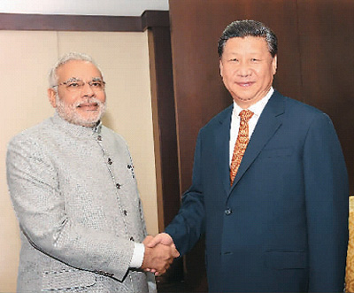 习近平强调,中印双方要加强交往,我期待着在不久的将来访问印度,欢迎莫迪总理早日访华。双方要对接各自发展战略,建立更加紧密的发展伙伴关系,扩大文化、教育、宗教、青年等领域友好交流,在铁路等基础设施建设、产业投资等领域打造一批示范性项目,扩大服务贸易、投资、旅游等领域合作,逐步实现双边贸易总体平衡和可持续发展,推进孟中印缅经济走廊建设,引领区域经济一体化进程。中印要加强多边领域合作,共同参与国际规则制定,增强发展中国家的话语权。中方欢迎印方作为创始成员加入亚洲基础设施投资银行。双方要以积极和向前看的态度管控和处理分歧,通过友好协商,尽早找到公平合理、双方都能接受的边界问题解决办法。在最终解决前,共同维护好边境地区和平安宁。