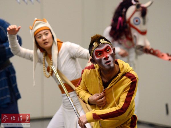 资料图片:2013年6月24日,杂技音乐剧《西游记》中的“孙悟空”(前)和“唐僧”在美国纽约排练。新华社记者王雷摄。