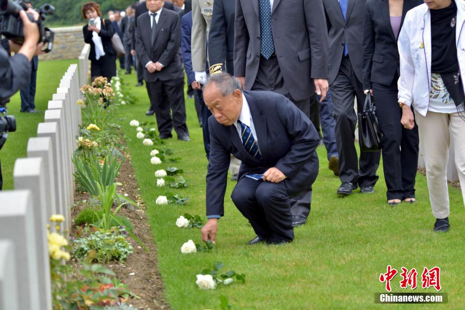 应法国政府邀请,中国政府代表李肇星出席法国政府在国庆日举行的第一次世界大战爆发100周年纪念活动,并在7月15日访法期间前往欧洲最大的一战华工墓地——法国索姆省滨海努瓦耶勒市诺莱特华工墓园,凭吊安葬在那里的884名一战华工。图为李肇星在墓园中凭吊。中新社发 龙剑武 摄