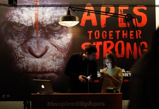 随着电影在全球上映,各地再度掀起了一股“人猿”风潮,在本届世界杯亚军国家阿根廷的某酒吧区,一群喜欢《猩球崛起》系列的艺术家玩起了涂鸦活动,霸气的猩猩领袖凯撒被再度艺术创作亮相酒吧外墙面,当日的DJ也头戴猩猩面具酷炫出场,为即将在阿根廷上映的《猩球崛起:黎明之战》预热。