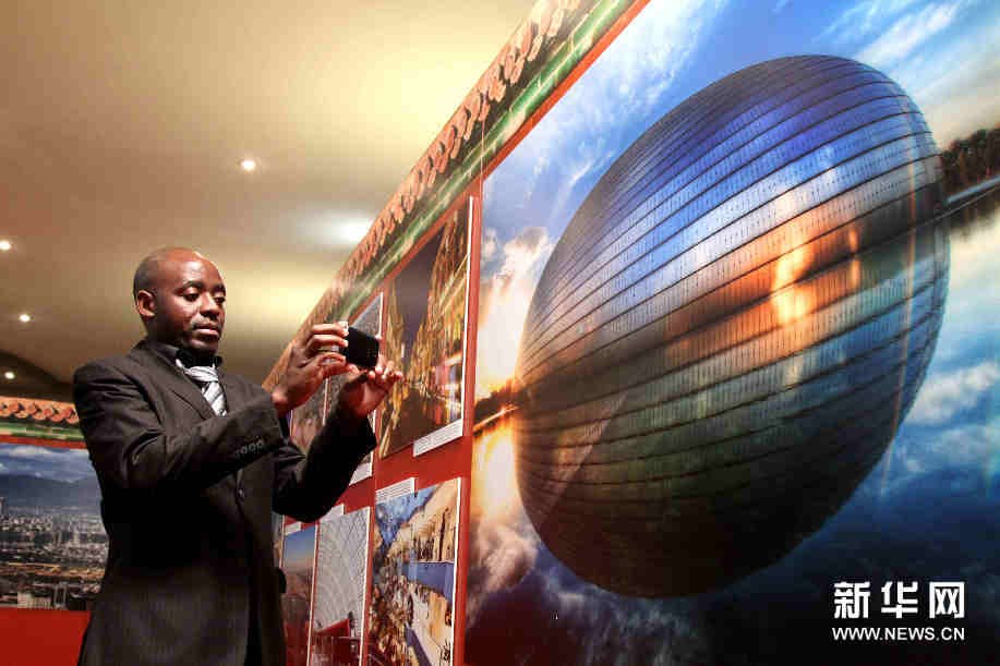 15日,在津巴布韦首都哈拉雷的庆典中心,一个当地人在参观“魅力北京”图片展布展。新华社记者 许林贵 摄