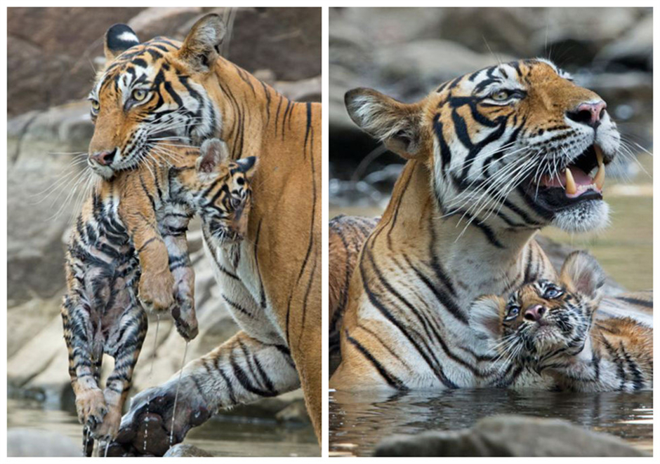 虎妈将虎宝宝衔在嘴里,带其进入水塘。